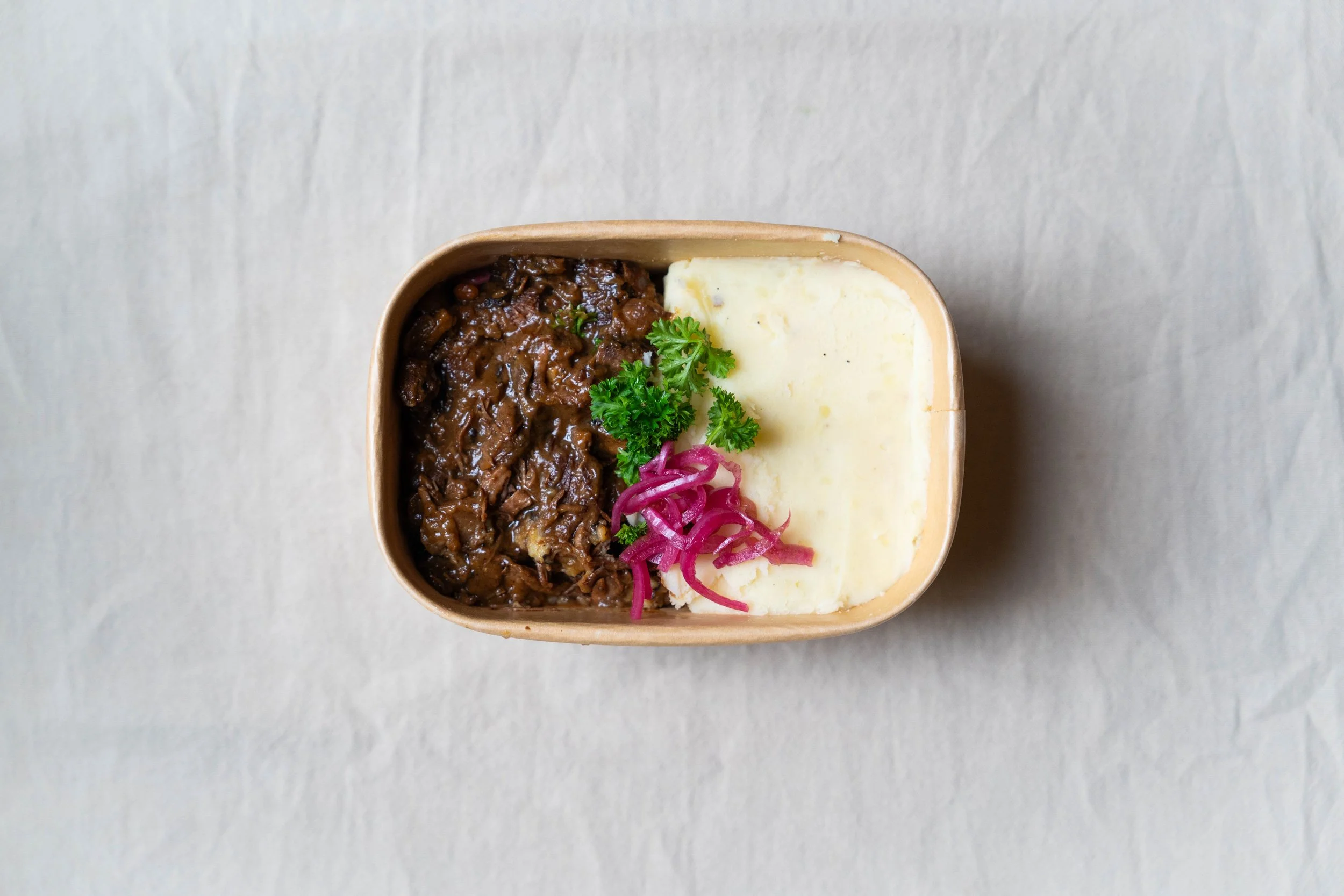 Ingrediënten: aardappelpuree (aardappel, melk, boter, zout, nootmuskaat), runderstoof (30% rundvlees, donker bier (gerstemout, tarwe, hop, water), wortel, ui, water, ontbijtkoek (roggebloem, glucose-fructosestroop, specerijen), mosterd (water, mosterdzaad, azijn, zout, specerijen), zonnebloemolie, zout, peper), ingelegde rode ui (rode ui, azijn, suiker, zout).